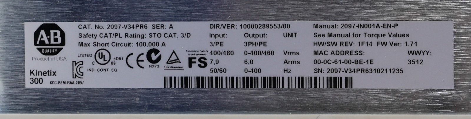 Allen Bradley 2097-V34PR6 /A Kinetix 300 Servo Drive 2097V34PR6 - Open Box