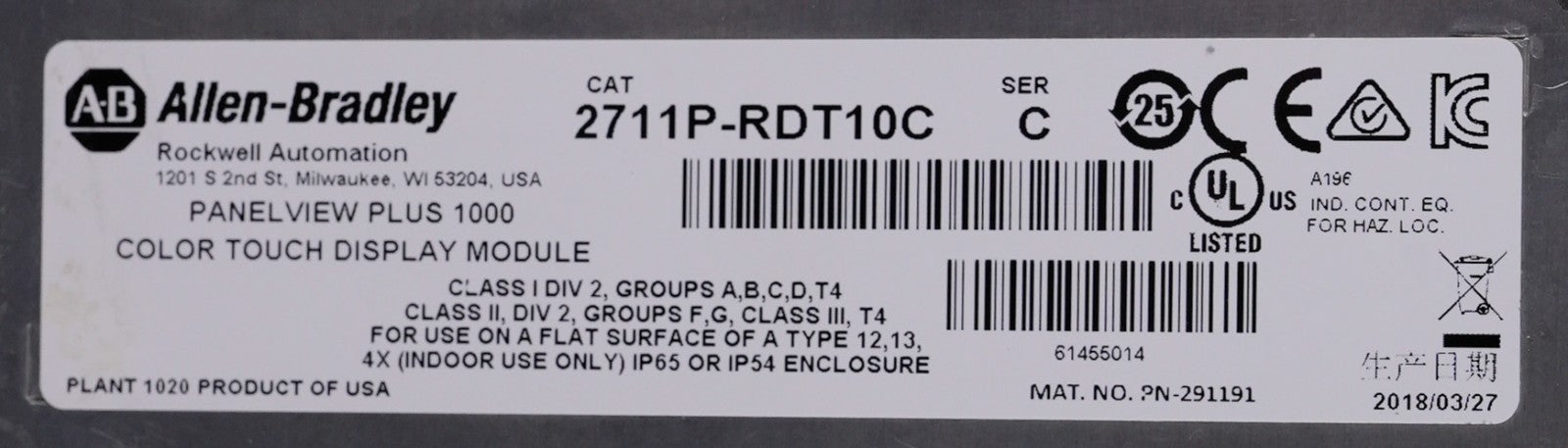 Allen Bradley 2711P-RDT10C /C Panelview 1000 Color Touch Display Module 10''