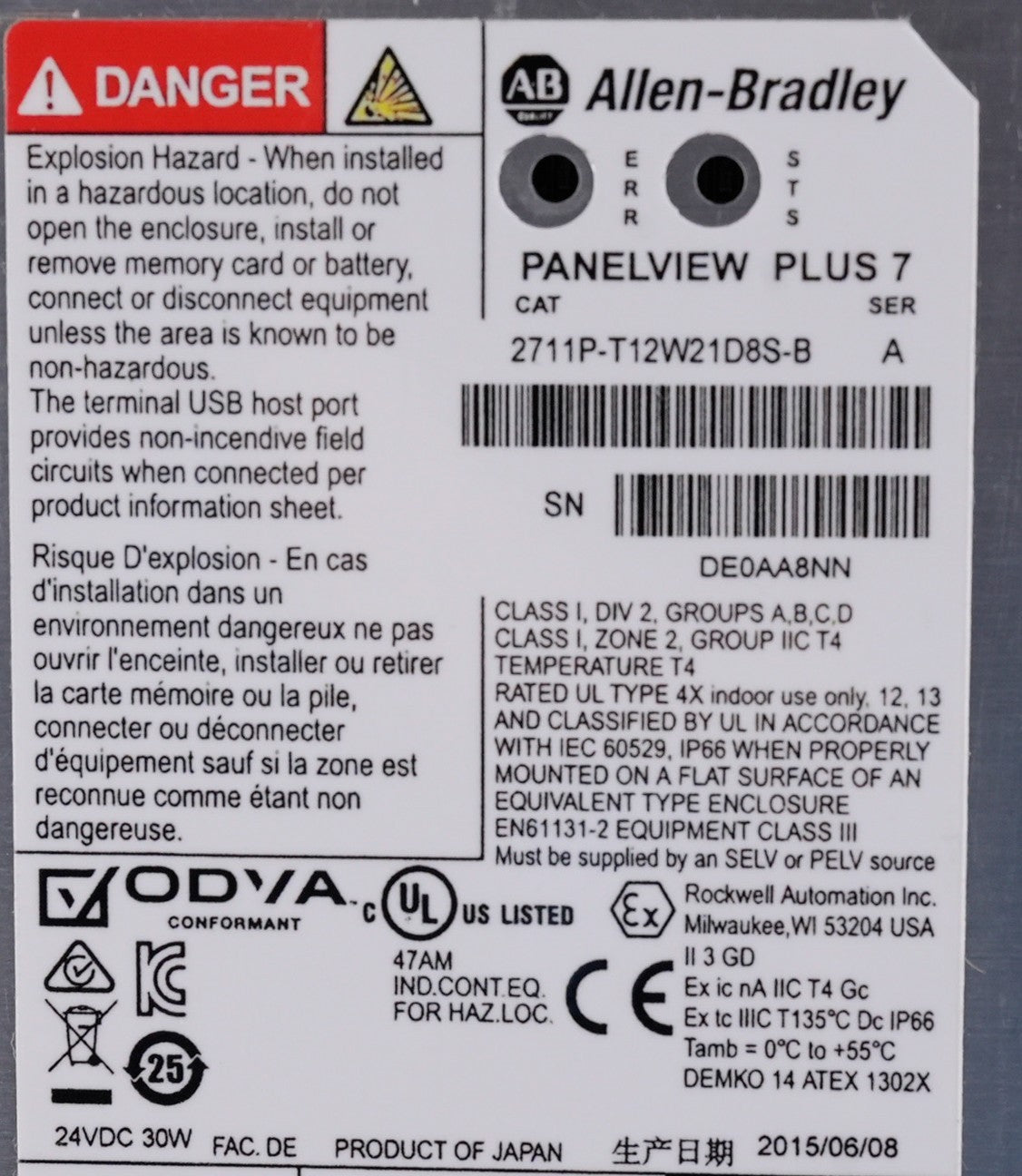 Allen Bradley 2711P-T12W21D8S-B /A Panelview Plus 7 Display 2711PT12W21D8SB
