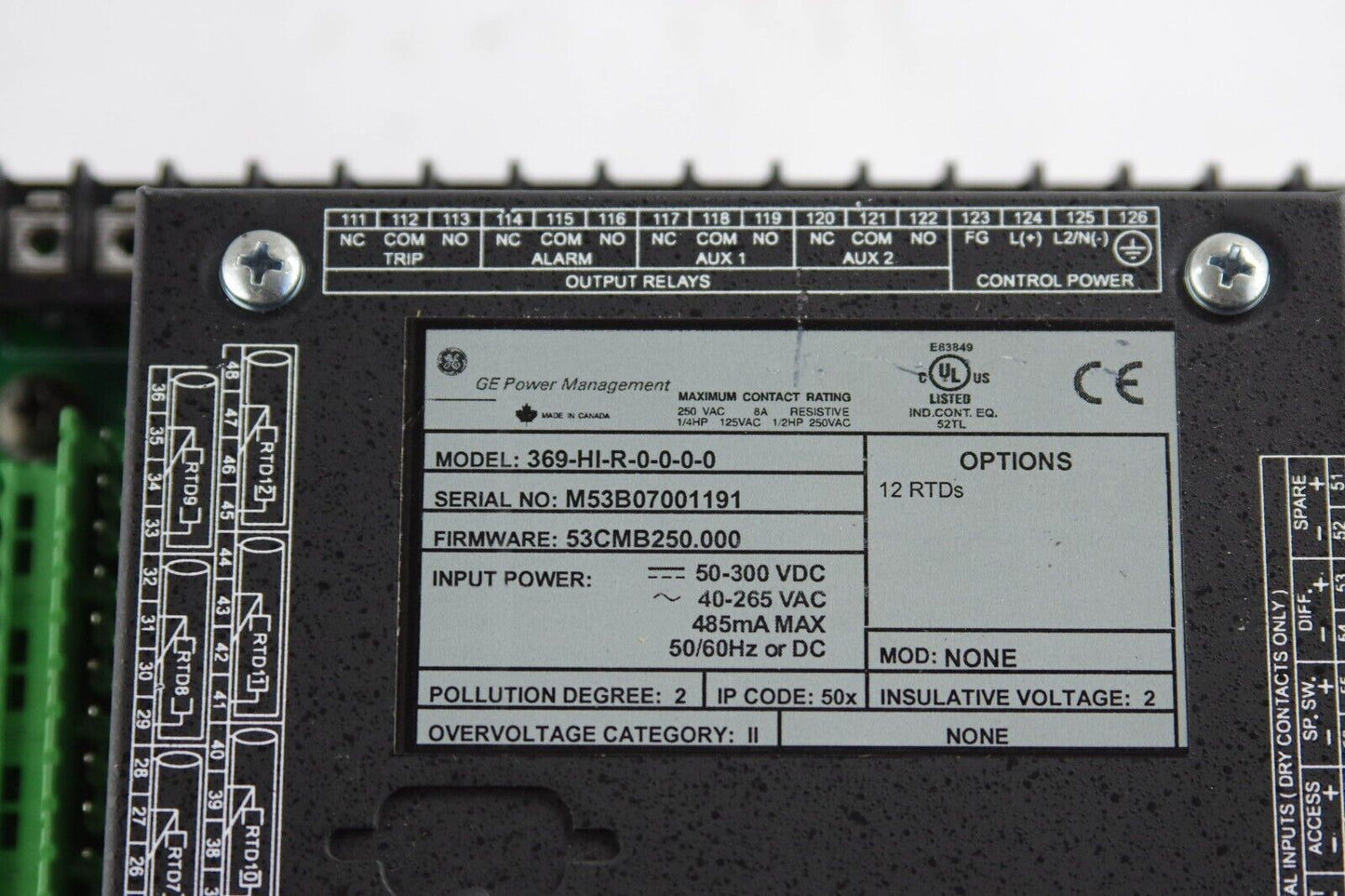 GE MULTILIN 369-HI-R-0-0-0-0 / 369HIR0000 Motor Management Relay 250VAC 8A