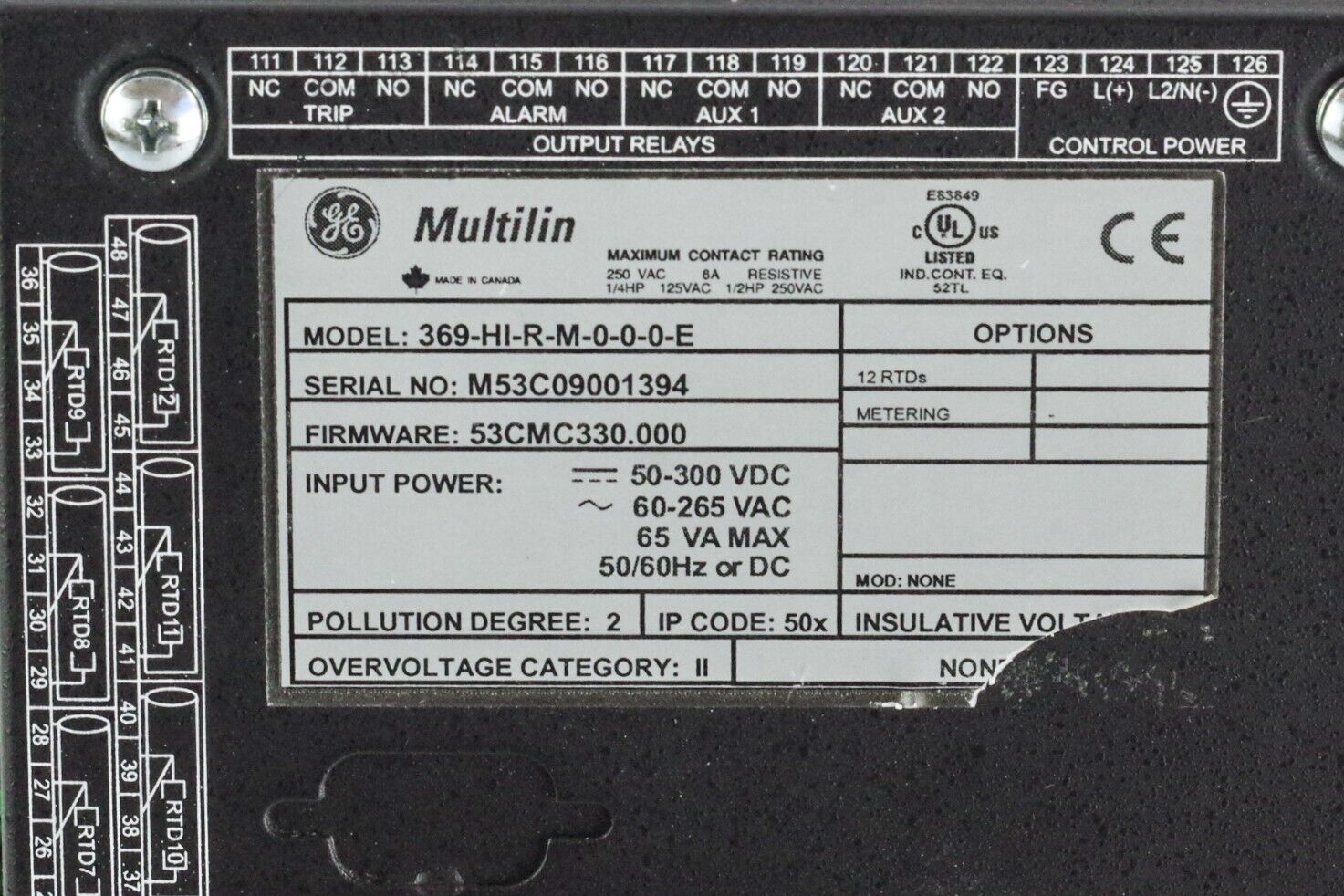 General Electric GE 369-HI-R-M-0-0-0-E Motor Management Relay Multilin 369